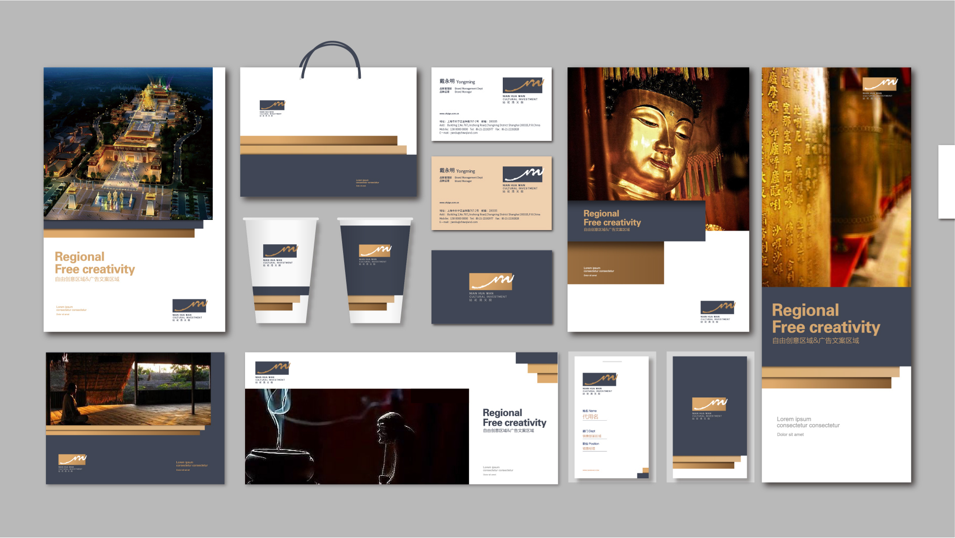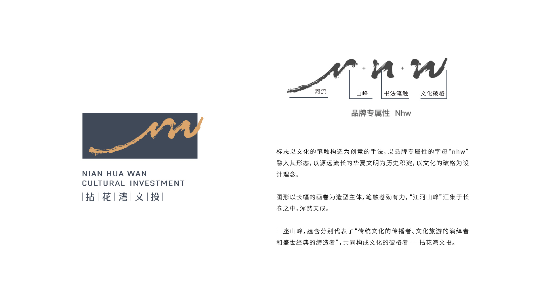 和與德通過多方研討,結合拈花灣文投的整體定位、發展目標、發展模式、產品體系、文化調性和目標群體等方面的考慮,設計了極富文化內涵的品牌標識。品牌標志以文化的筆觸構造為創意的手法,以品牌專屬性的字母“nhw”融入其形態,以源遠流長的華夏文明為歷史積淀,以文化的破格為設計理念。
